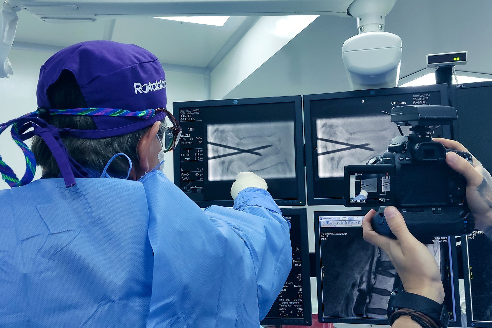 La vertebroplastia consiste en colocar por vía percutánea una aguja dentro del cuerpo vertebral guiado por vía fluoroscopia (cámara de RX en vivo). Una vez que la aguja se encuentra en el interior de la vértebra, se coloca un acrílico llamado metil-metacrilato, comúnmente llamado cemento. Este cemento entra de forma líquida al cuerpo vertebral, rellenando todos los espacios vértebrales y luego se endurece en los siguientes minutos, de esta manera se crea una especie de yeso interno en la vértebra qué le da solidez a la misma y mejorando así el dolor.