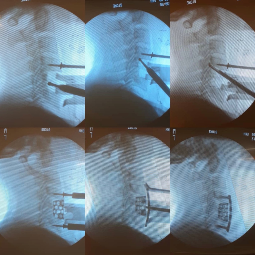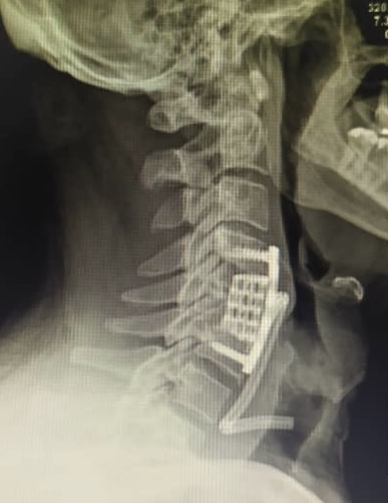 Esta es la placa post-operatoria inmediata donde se colocó una cesta en el sitio donde se quitó la vértebra y se reforzó con una placa por vía anterior. Se pudo realizar una descompresión completa de la médula.