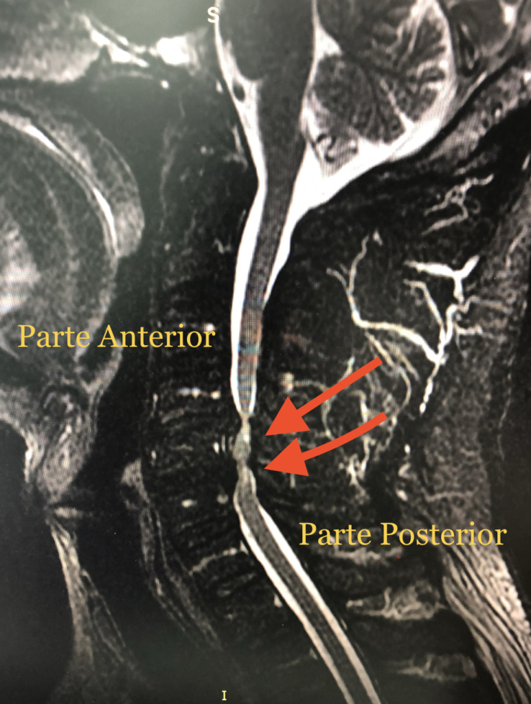 Esta es una resonancia magnética, donde las flechas rojas Ubican 2 a de compresión severa de la médula. En este caso se decidió hacer una cirugía por Via Anterior, para quitar una vértebra completa y poder hacer una descompresión amplia y segura.